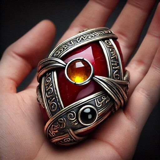 A smoothed, palm-sized red gem, framed in ornate platinum and gold metalwork carved-through with ancient runes and adorned with two small rounded stones, each the size of a thumbnail.