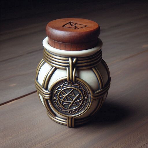 A small jar, 3" tall and 2" in diameter, wrapped at the top by a sigil-engraved brass ring, and sealed with a wooden lid wrapped by a matching ring.